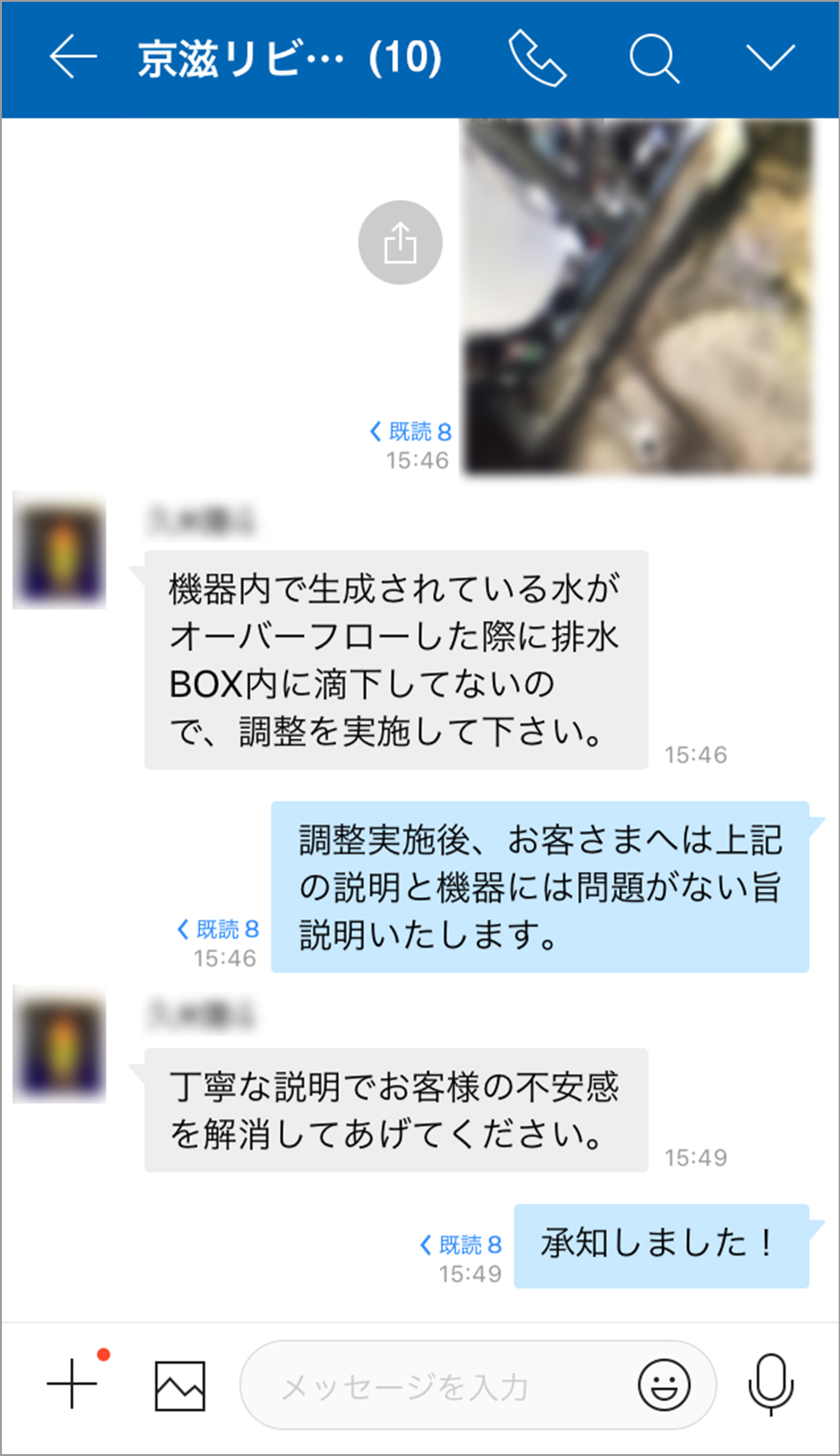 お客様のお宅で対応の難しい状況に直面した場合、以前はいったん事務所に戻って上長の指示を仰いでいましたが、LINE WORKS導入後は上長に現場写真を送って対応の指示を仰ぐことで、事務所に戻ることなくその場を円滑に対応できることが多くなりました。