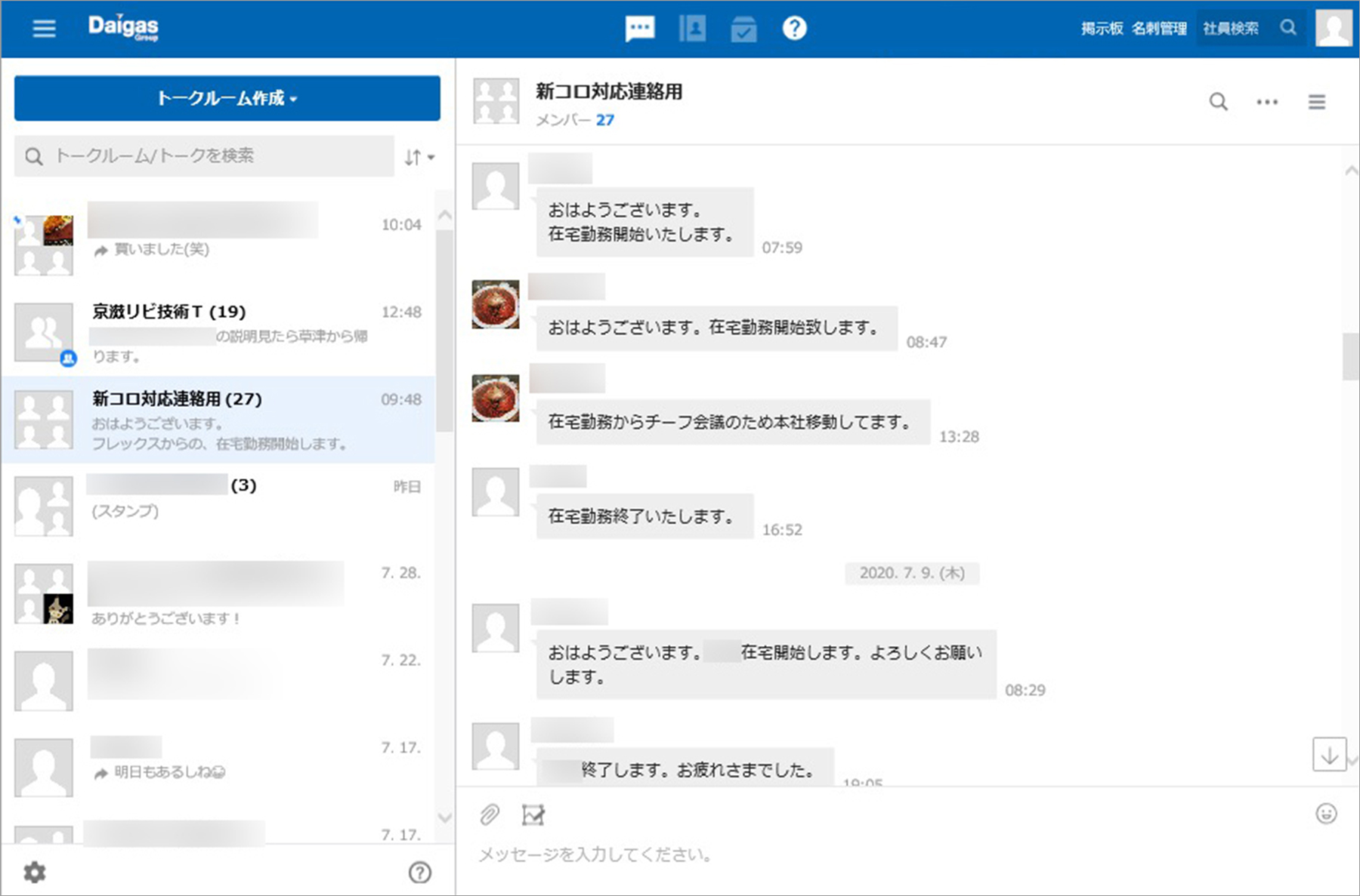 総務グループをはじめ、新型コロナへの対応で多くの社員がリモートワークをするようになったことから、在宅勤務の開始と終了の連絡をLINE WORKSで行うようになりました。メールだと一方的な情報発信になりがちですが、上司にトークで業務開始を告げると「お願いします」といったリプライが得られ、ちょっとしたコミュニケーションが生まれるのもチャットの利点です。