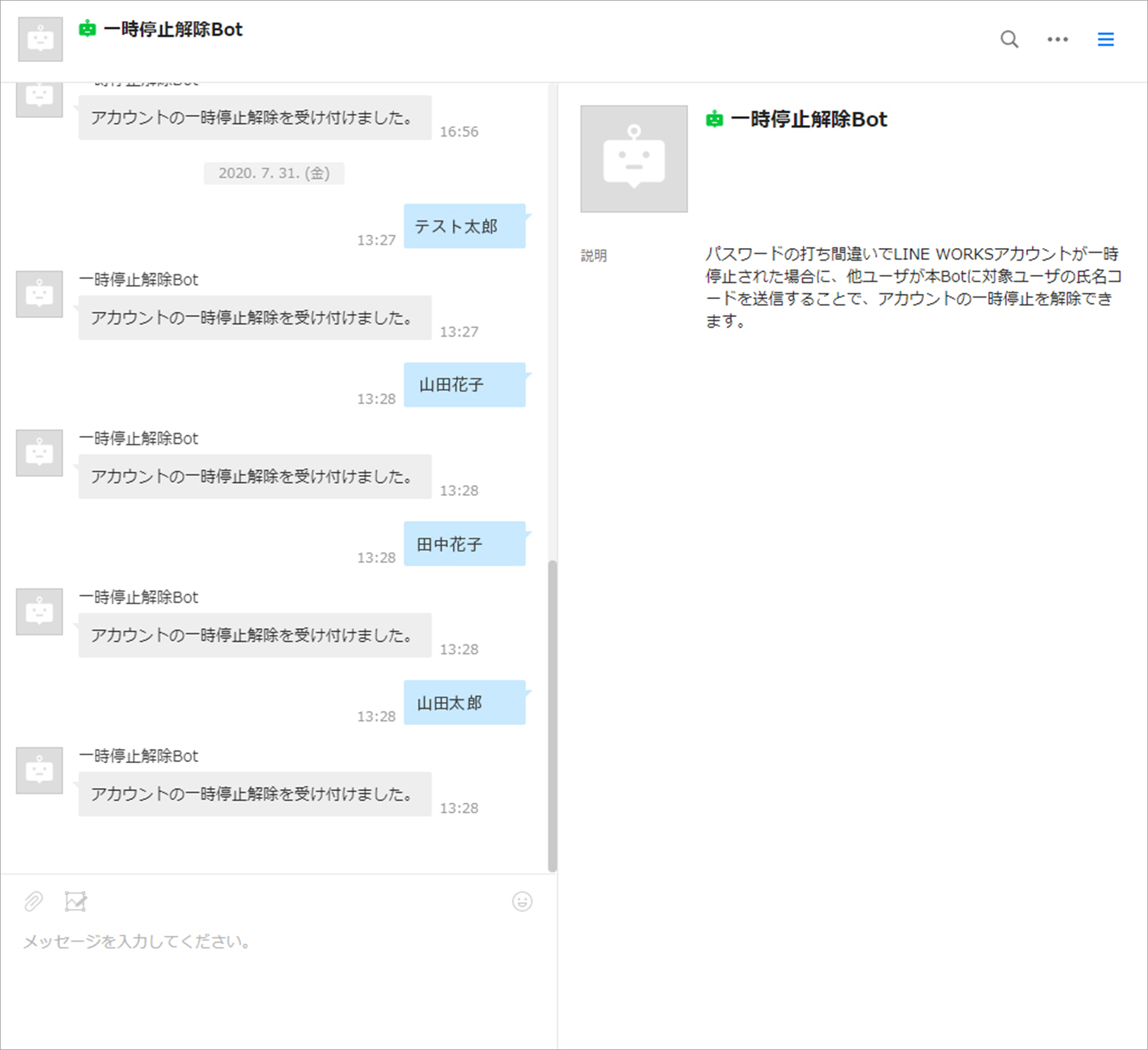 当社は自社開発したID管理システムを利用しており、LINE WORKSとAPI連携(アプリケーション間の機能共有による情報連携)を行うことで、入社・異動・退社時のアカウント管理を自動化しています。また、情報通信部の問い合わせ対応を軽減する施策として、ユーザーがログインパスワードを数回誤入力してLINE WORKSのアカウントがロックされたときに、他の社員のLINE WORKSでアカウントロックされたユーザーの氏名をトークするとロックを自動解除するチャットボットを試行的に運用しています。