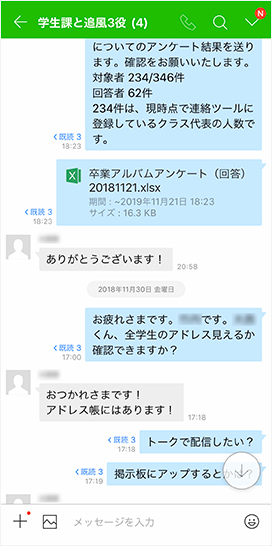 「学生支援課+学友会追風運営委員会」のトークルームでは、さまざまな連絡や会合の日程のリマインドを手軽かつ確実に行えるようになりました。こちらから発信したトークに対してすぐに返信がなくても、既読か未読かが分かるだけで安心できることも少なくありません。