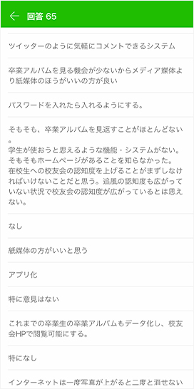 また、卒業アルバムをこれまでの冊子からウェブ上でデジタル化することが以前から検討されており、それに対する学生の意向を把握するため、アンケート機能でクラス代表者から書き込み式で意見を収集し、その回答を参考にしてデジタル化が決定しました。人前で発言することに抵抗感を持つ学生もトークルームへの書き込みならしやすく、大学が学生たちの「生の声」を拾い上げられるようになったのも、LINE WORKSを導入しての大きな成果です。