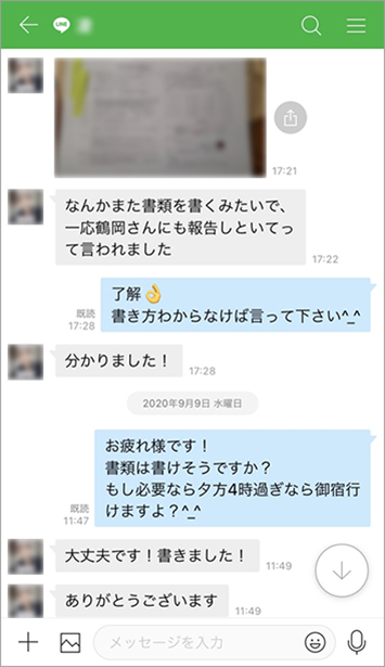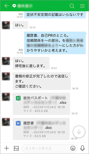 求職者とは、担当職員との1:1のトーク機能でやりとりをしています。例えば、「履歴書の書き方がわからない」というご相談に対しては、記入例が掲載されている資料の画像データやPDFファイルを送信し、「これを見ながら書いてみてください」とお伝えしています。電話では説明しづらい資料でも、画像なら一目でわかるのでお互いに安心しますね。