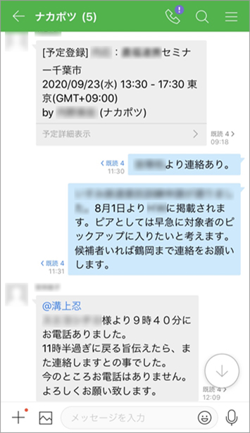 基本的に職員は外出していることが多いので、必ず1名は電話受付として事務所に待機しています。障がい者雇用を推進されている企業やほかの就労支援施設、医療機関とも連携したり、担当地区の福祉課から求職者を紹介されたりすることもあるので、そういった関係機関からの問い合わせがあります。担当職員が不在で電話がつながらないことも多いので、その際にはトークグループへ「〇時〇分に、〇〇様から電話がありました」とすぐに共有しています。以前は職場に戻ってから回覧板を確認していましたが、トークグループなら即時に全員と共有できるので、外出先でもタイミングを逃さず折り返し等の対応ができるようになりました。