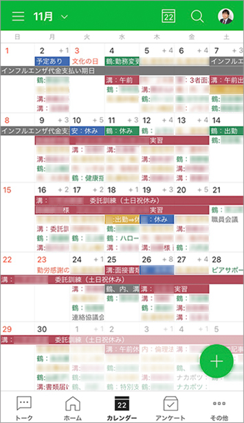 カレンダー機能も毎日のように活用しています。外出先でもリアルタイムで入力したり、自分やメンバーの予定を確認したりすることができるので、求職者や関係機関からの問い合わせにもすぐに答えることができています。今までは事務所のホワイトボードでスケジュール管理をしていましたが、カレンダー機能を使いはじめて2か月ほどでホワイトボードへの書き込みがなくなり、自然に完全移行できました。