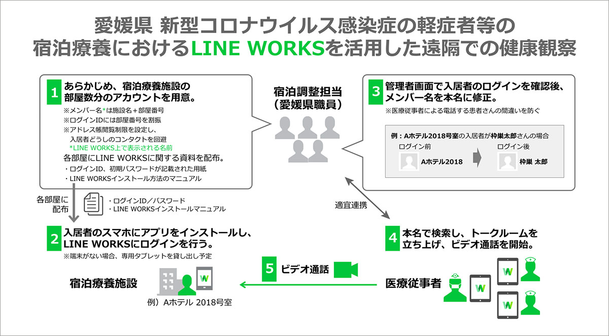 令和2年4月上旬、厚生労働省より新型コロナウイルス感染症の軽症者等について、民間の宿泊施設等での宿泊療養を実施する旨の方針が発表されました。愛媛県においても宿泊施設において感染症対策のひとつとして、LINE WORKSのビデオ通話機能を使ったオンラインによる健康状態の確認を開始しました。医療現場での活用について、詳しいお話を愛媛県保健福祉部医療対策課主事の薦田有理様に伺いました。