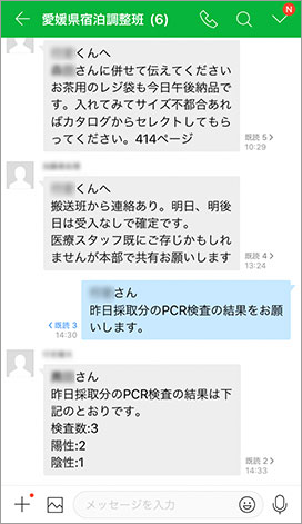 宿泊調整担当の職員どうしはトーク機能を活用しています。医療機器などの物資の調達や患者さんの入所・退所スケジュールの共有、PCR検査で得た検体を保健所へ提出するといった事務連絡に使っています。こういった連絡は即時性を重視しているので、すぐに全員への確認と返信ができるトーク機能はとても便利です。