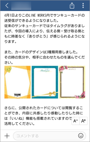 「サンキューカード」という御社独自の取り組みにもLINE WORKSを活用されていますね。具体的な取り組みを教えてください。