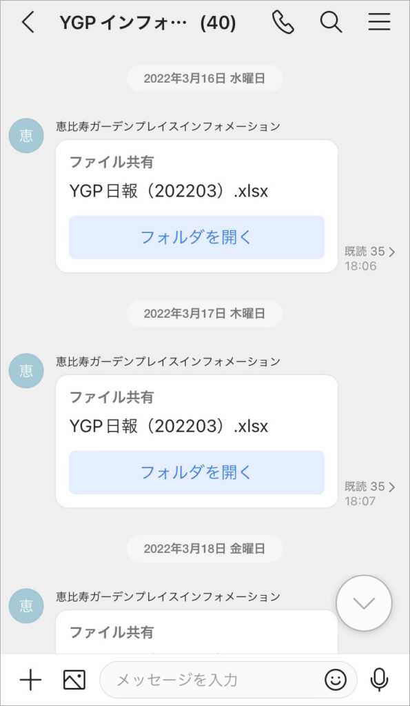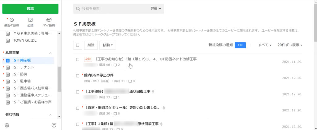 サッポロファクトリーでは、「SF(サッポロファクトリー)テナント」「SF防災」「SF駐車場」「SF催事スケジュール」「SFご指摘・お客様の声」など、業務カテゴリーごとのグループを作成。業務委託先とのあらゆる情報共有をトークや掲示板で行うようになりました。以前のグループウェアとは違いスマホアプリで操作できるので、メッセージを確実に伝達でき、未読/既読も一目瞭然なのがメリットです。