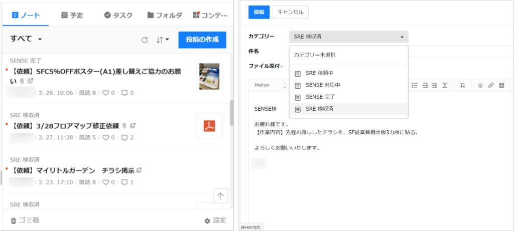 トークグループのメンバー専用の掲示板として機能するノートも活用しています。メンバーに業務を依頼するときは、ノートの機能にあるカテゴリーを「依頼中」に振り分けて投稿し、完了後は「検収済み」のカテゴリーに移すことでタスク管理をしています。メンバー全員が案件の状況を確認できるので、対応漏れなどが少なくなりました。