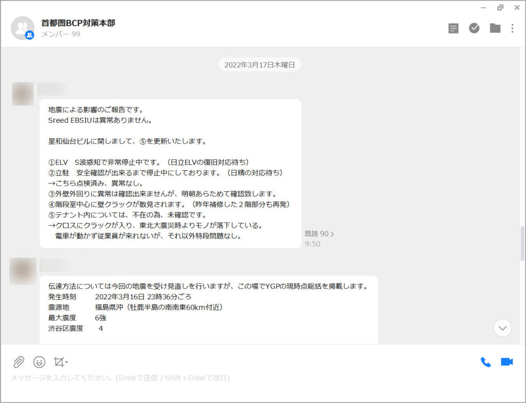 2021年10月に東京23区で震度5強以上を観測した地震が起きたときは、恵比寿事業本部が管理する多数の物件の被災状況を実際にLINE WORKSで確認しました。以前は各物件の担当者から電話で報告された内容をホワイトボードに記して全容を把握していましたが、トークなら個々の報告をメンバー全員が瞬時に共有することができます。