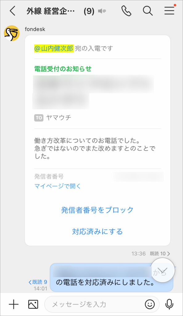 電話受付代行サービスfondeskとLINE WORKSを連携させ、恵比寿事業本部でも札幌事業本部でも、代表電話にかかった電話を受けたオペレーターが、受電内容をテキストにして個々の担当者にトークで送信してもらう仕組みを構築。代表電話の対応に追われていた総務人事部の負担を大きく減らすことができました。