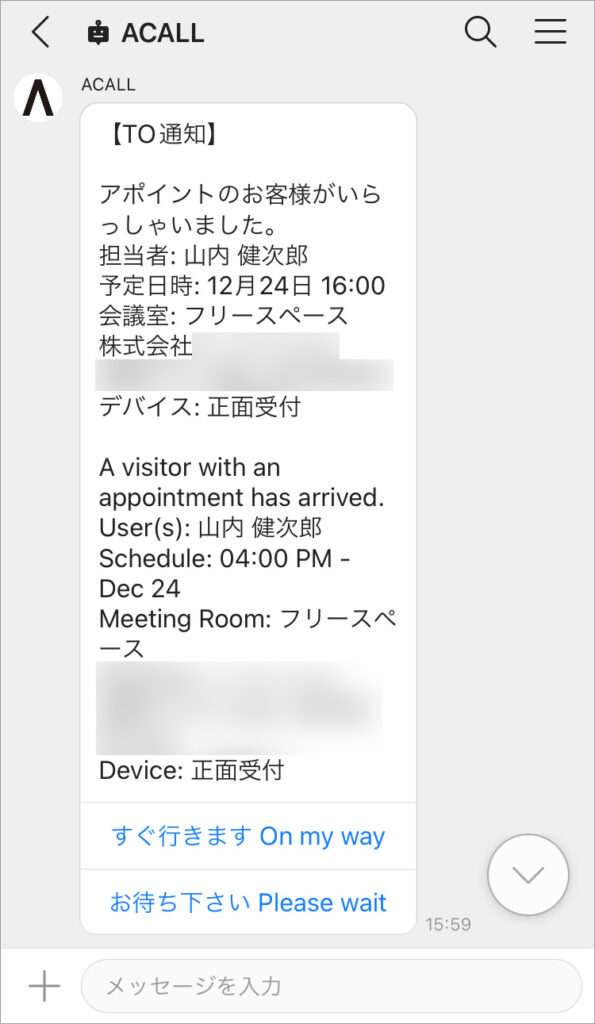 受付業務の省力化に向け、ワークスペース管理プラットフォームWorkstyleOSとも連携。来社されたお客様が受付でチェックイン手続きをすると、来訪通知が自動的に各担当者にトークで送信されるようにしています。