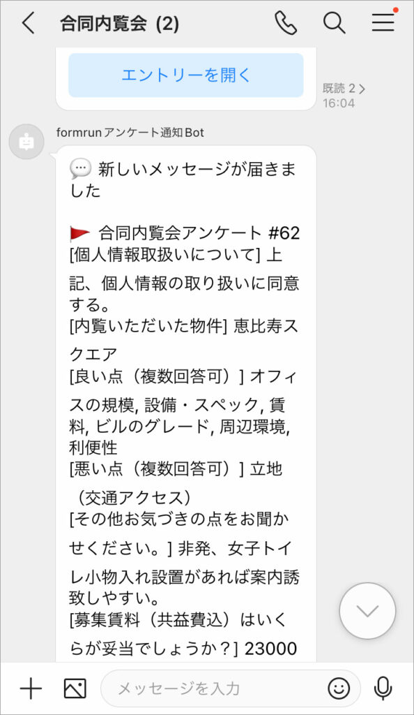 また、フォーム作成管理ツールformrunとも連携させ、アンケート作業にかかる負担を軽減させました。オフィスなどの賃貸物件のリーシングを行ってくれる不動産会社を集めて内覧会を行った際に、意見収集のためにアンケートを行っていますが、以前は会場で用紙を配付して回答をFAXで送信してもらっていました。今は会場でQRコードをスマホで読み取ってもらい、Formrunのアンケートフォームに必要事項を書き込んで送信してもらえば、その内容が直ちにLINE WORKSのトークに通知され、内容が確認できます。ほとんどの担当者がその場で記入してくれるので、不動産会社の意向を把握して素早く価格設定ができるようになりました。