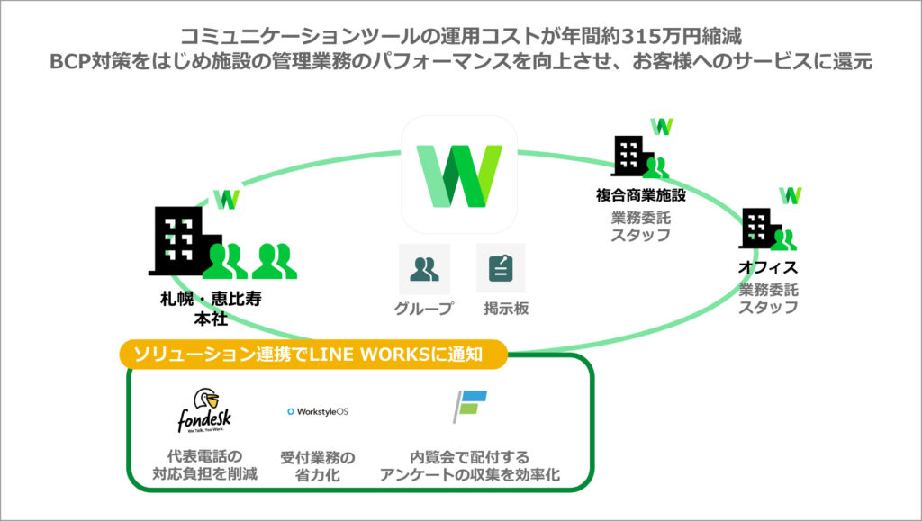 「恵比寿ガーデンプレイス」や「サッポロファクトリー」などの複合商業施設やオフィス、ホテル、その他の不動産物件を運営・管理するサッポロ不動産開発株式会社は、災害発生時などの情報共有体制を強化する目的でLINE WORKSを導入しました。BCP対策をより強固にするとともに、既存のグループウェアをLINE WORKSに置き換え、施設の管理業務を委託している協力会社のスタッフと自社社員がスムーズにコミュニケーションを取れる環境を構築。社内システムとのAPI連携によって業務の自動化・省力化を図るなど、オフィスのDXも意欲的に推進しています。