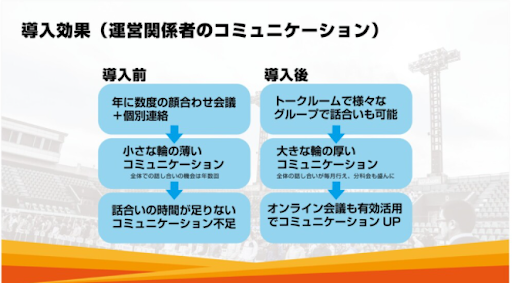 以前の実行委員のメンバーや事務局など大会の関係者との連絡手段は、メールや電話といったアナログなものでした。大会終了後には休みなしに翌年の準備が始まるので、1年を通して日々関係者は連絡を取り合っています。その準備に関わる人の年代は、幅広く60歳を超える方もらっしゃいます。会長や事務局長、実行委員長など主要な方とアドバイザーが、「今後どうする」「実行委員会の議案どうしましょう」と個別にメールや電話でご意見を伺っていました。事務局に対する作業依頼や進捗の確認も同様でしたので、多くのメンバーがいますので、情報の伝達がとにかく大変でした。
