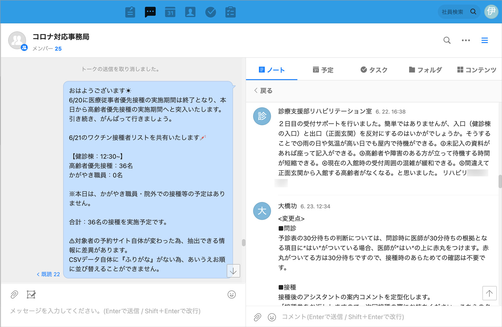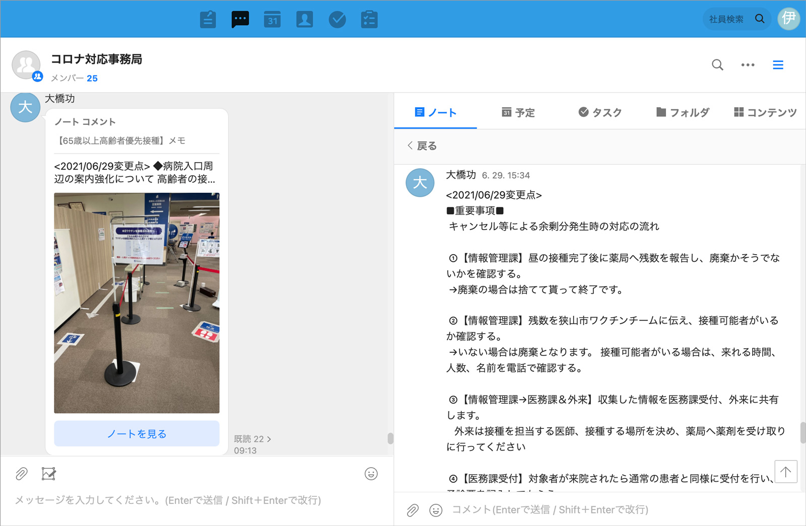 当院は医療従事者にワクチン接種をする医療機関にも指定され、後に一般のご高齢者や地域の企業にお勤めの方への接種もすることになりました。1日60件ほどの接種の予定は市の予約管理サイトに掲載されましたが、担当者の確認のしやすさや急な予約の変更等に柔軟に対応したいことからLINE WORKSのカレンダーに登録して管理しました。また、接種会場の設営方法や、院内の動線確保のやり方など、ワクチン接種に関する情報共有にノートや掲示板を活用しています。