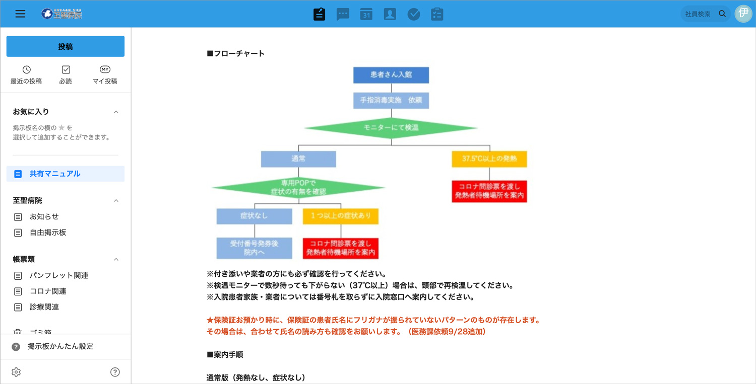 次のステップでは、病院のエントランスに設置した検温器で発熱があると認められた外来の患者さんを他の患者さんと交わることなく専用の待合室や検査室に誘導する動線や、熱のある患者さんへの接し方、感染防止のノウハウなどをノートに投稿。手順の動画や画像も添えることで、全職員に正しい理解を促しました。ノートを見た職員から意見が出たり、よりよい方法を提案されたりするのを受けて、内容を少しずつブラッシュアップ。最終的にルールや見解が確定したと判断された項目については掲示板に掲載するという流れが出来上がりました。