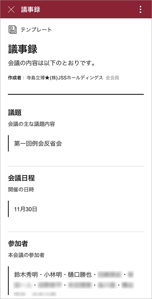 テンプレートを活用し、議事録を即時に共有