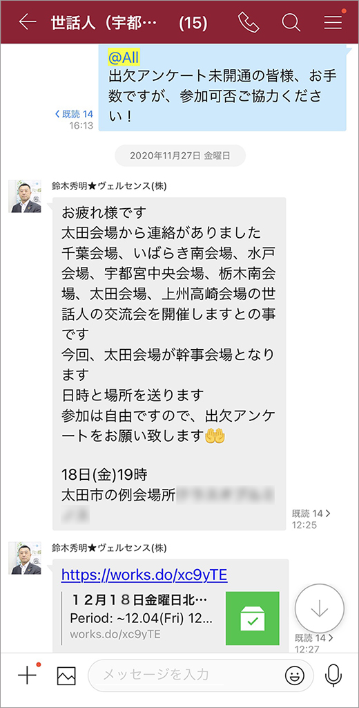 他会場との交流会や会員拡大のために開催するイベントなどは、事務局が人数を把握し会場を手配しなければなりません。出欠や出展募集などは、LINE WORKSのアンケート機能を活用して集計しています。複雑な受付手続きはないので集計作業の負担が軽くなりました。
