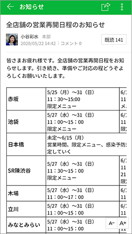 本部から全社員向けの情報を発信すると即座に多数の既読がつき、伝達事項がしっかり届いていることを目で確認することができます。電話やメールよりも迅速かつ確実に情報を伝えられ、なおかつ発信した情報はログとして残るので、「言った、言わない」といったトラブルの発生も未然に防げるようになりました。