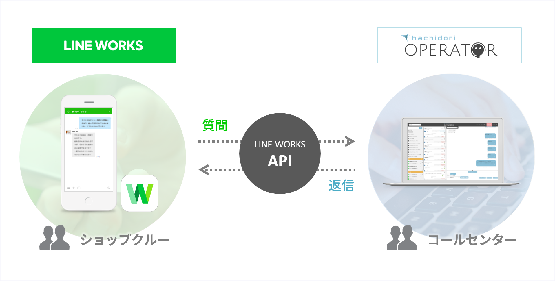 問い合わせの内容・件数や回答までの所要時間などを統計データとして蓄積し、サービス内容改善に役立てるため、コー ルセンター側にはプログラミングレスチャットボット開発運用ツールhachidoriを導入しました。hachidori OPERATORはLINE WORKSとの連携実績があるので、他のソリューションに比べてスムーズに導入・運用することが期待されました。