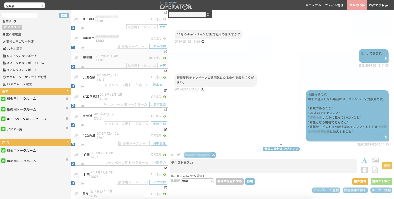 LINE WORKSでは料金やキャンペーン等に関する問い合わせのためのトークルームと、端末操作に関する問い合わせをするトークルームを開設し、クルーが目的のトークルームにトークするとコールセンターのhachidori OPERATORに表示され、オペレーターが適宜対応する仕組みです。