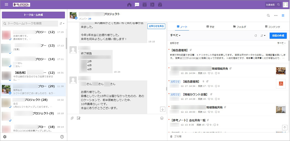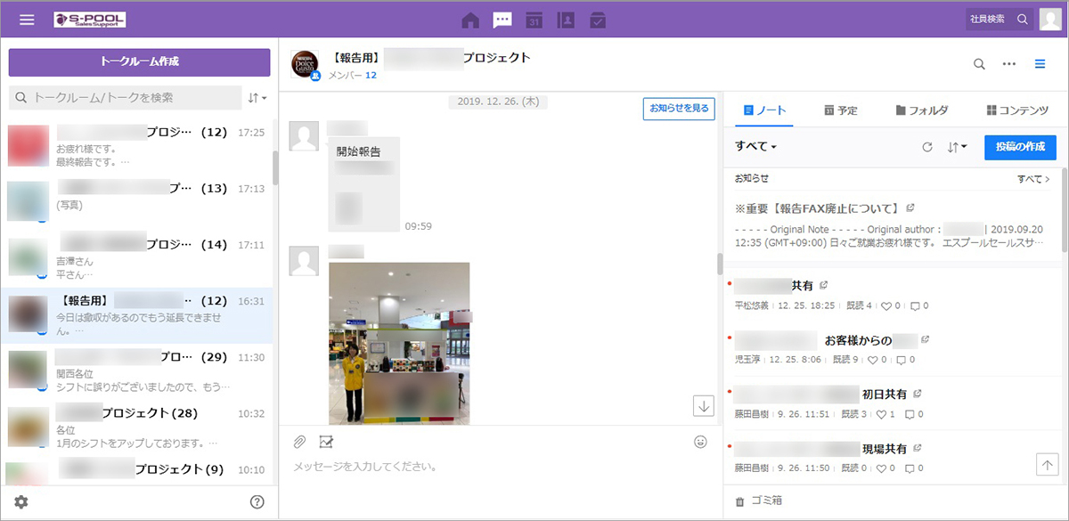 商材に関する情報の急な変更や、セールスプロモーションに関するクライアントからの提言など、スタッフに周知徹底を図りたい情報については、長期間保存できるノートに保管し、必ず閲覧するようトークで促しています。販促に役立ちそうな商材に関するインフォメーションをスタッフがテキストや写真で自発的にアップすることもあり、ノートも重要な情報を共有する上で大いに活用しています。
