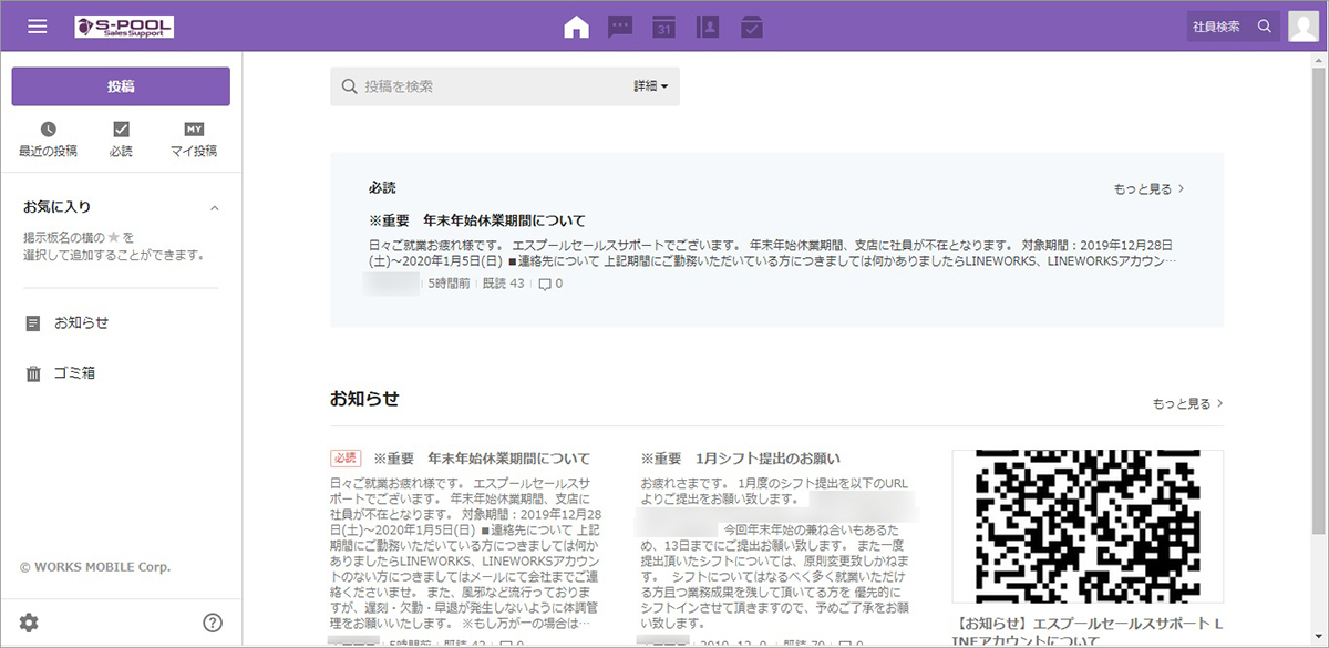 また、自然災害に伴うトラブルで社員の出退勤打刻システムが一時的にダウンした際には、LINE WORKSのトークかメールで出退勤時刻を報告してもらうようホームで案内することで混乱を未然に防止。セールスプロモーションの現場以外での情報伝達にも役立っています。