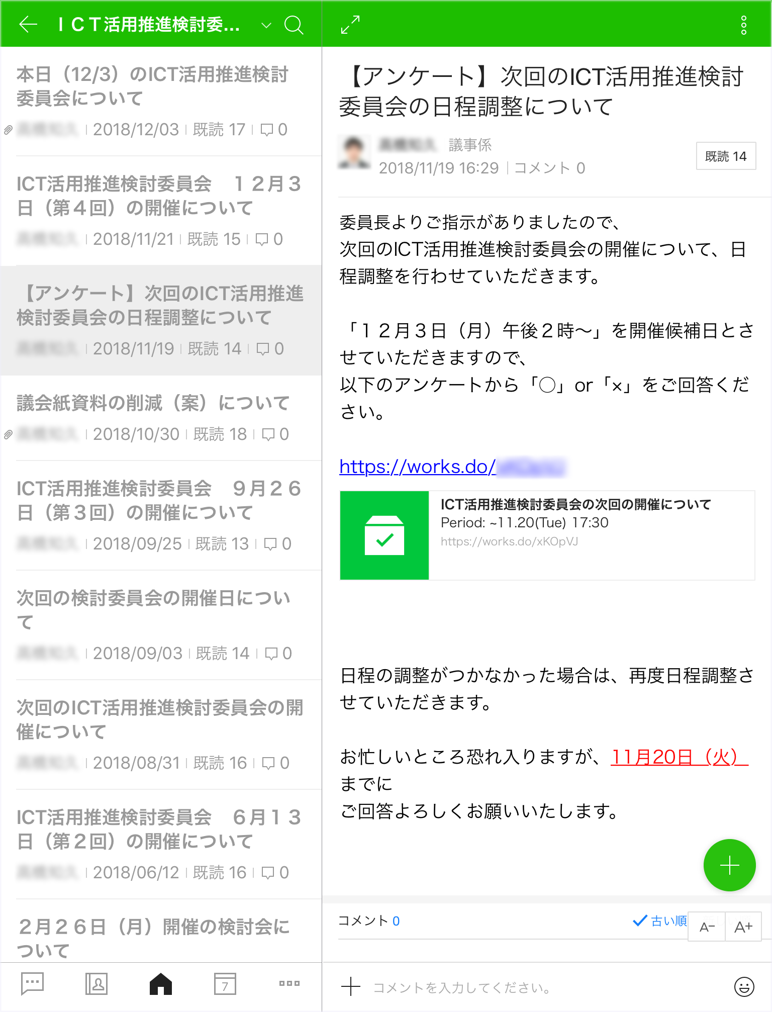 ホームで委員会ごとに掲示板を作成し、事務局からの連絡を投稿しています。議会前と議会中は連絡事項が多いので、ホームは頻繁に使います。グループトークの投稿ですと画面上で流れてしまうので、一定期間固定したい大事な情報の掲示にはホームが適しています。日程調整はアンケートを使いますが、ホームに投稿することで閲覧場所を集約させ確認漏れを防いでいます。