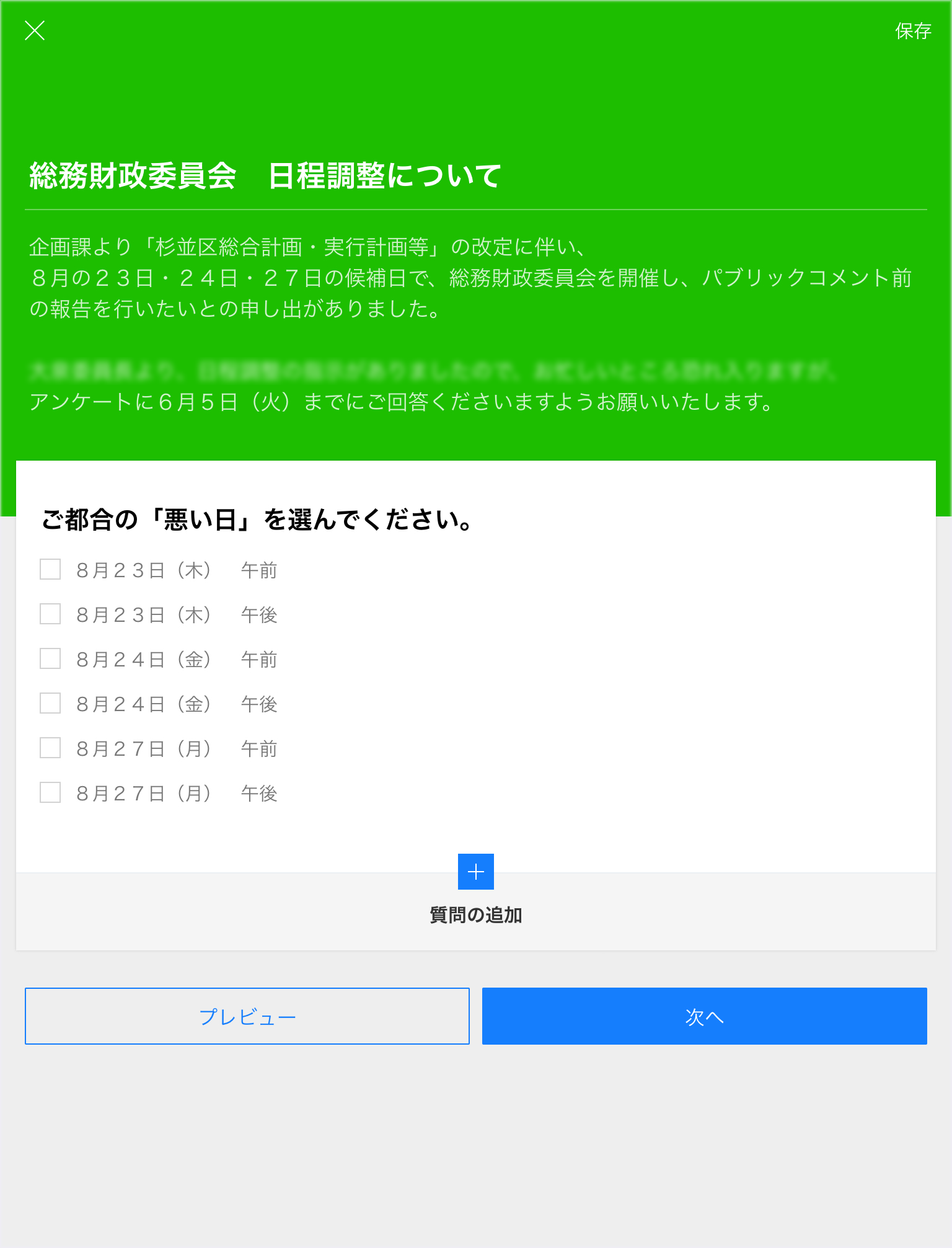 杉並区議会には、5つの常任委員会、議会運営委員会、4つの特別委員会の合計10の委員会があり、それぞれ10名前後の議員が所属しています。委員会を横断的に取りまとめているのが事務局です。事務局は秘書的な役割も担ってくれているので我々議員としては非常にありがたい存在です。しかし、会期が迫っているのに議員から回答がこない、1人だけ日程が合わず最初から調整し直さなければならない、といったことの繰り返しで、事務局の心理的負担も大きく、その負担を軽減したいという思いが一番にありました。