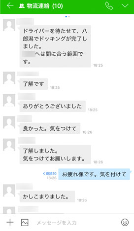 自社製品は毎日2回(第1便、第2便と言う)のトラックで当社工場から出荷されますが、製造の都合で第1便の出荷に間に合わなかった商品を第2便に乗せ、少しでも早く納品するために第1便と合流して受け渡しをするといったことがあります。このような状況も、LINE WORKSで担当者に素早く通知されるようになり、納品先には正確な納品時刻を迅速にご案内できるようになりました。