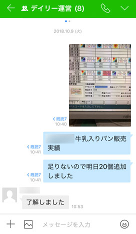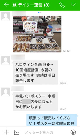 デイリー事業部の部員は販促活動の参考にするために、各店舗の新商品やキャンペーン商品の陳列の工夫、売上実績などを頻繁にやり取りしています。会社で管理している環境下で情報交換できるセキュアなLINE WORKSを導入したことで、陳列写真や数値データなどあらゆる情報を安全に発信できるようになりました。当社のパン商品は消費期限があり陳列期間が特に短いので、リアルタイムの売上データをグループ全員へ瞬時に共有できるLINE WORKSの即時性にも効果を感じています。