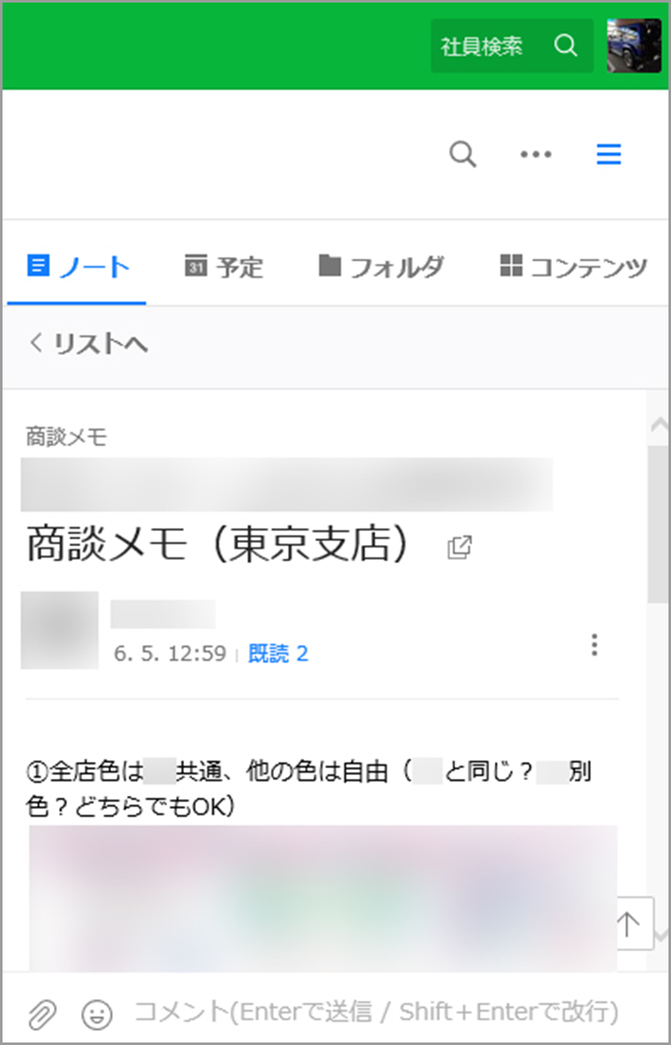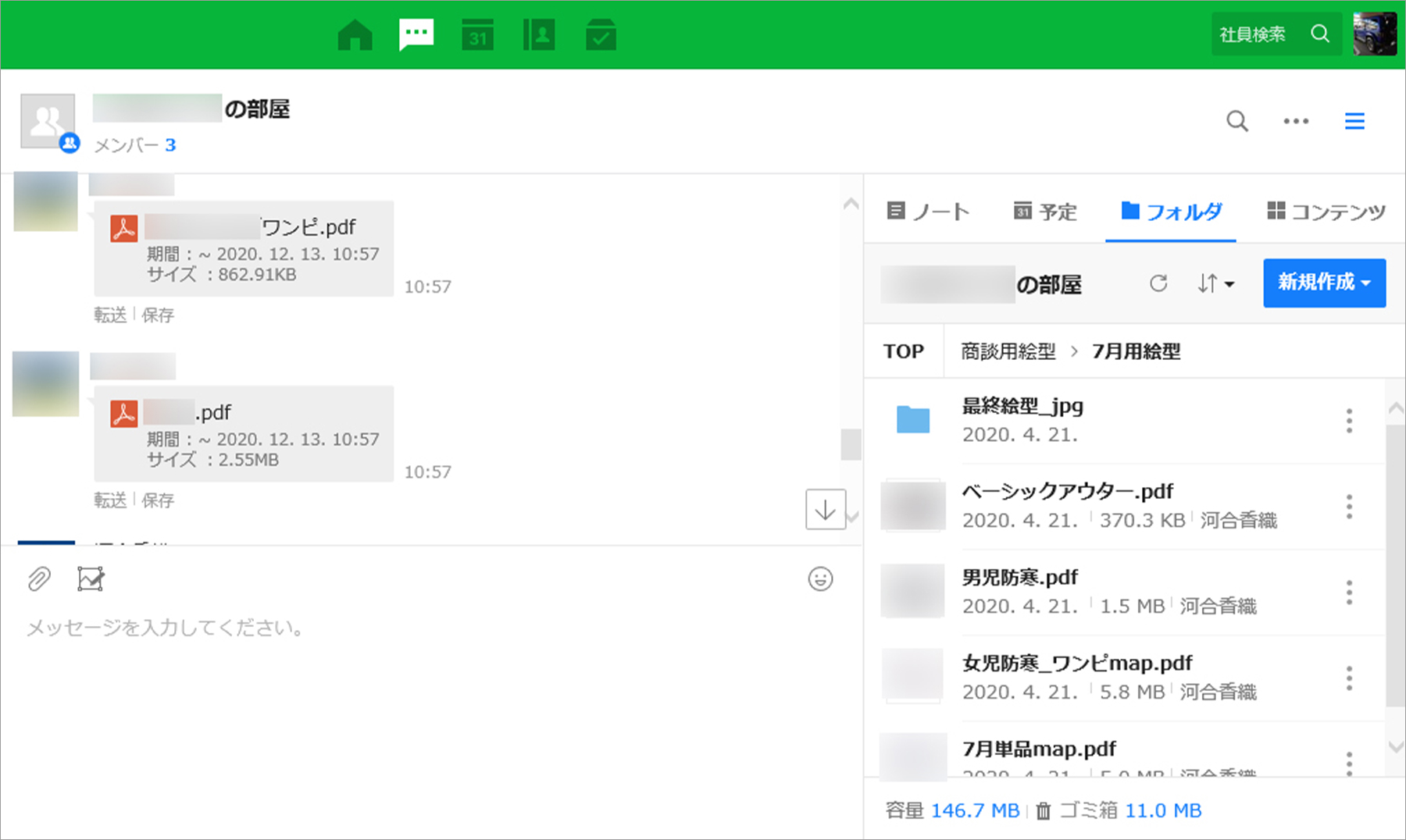 私の課ではお客様(バイヤー)ごとに、担当する営業社員・デザイナー・私がメンバーとなってグループトークルームを設け、トークで業務連絡をしています。タイムラインで流れては困る商談に関する内容は、案件別にしてノートに、デザイナーが作成した服の絵型の画像はフォルダに保存することで、案件ごとの商談プロセスをメンバー全員が時系列に把握できるようになりました。