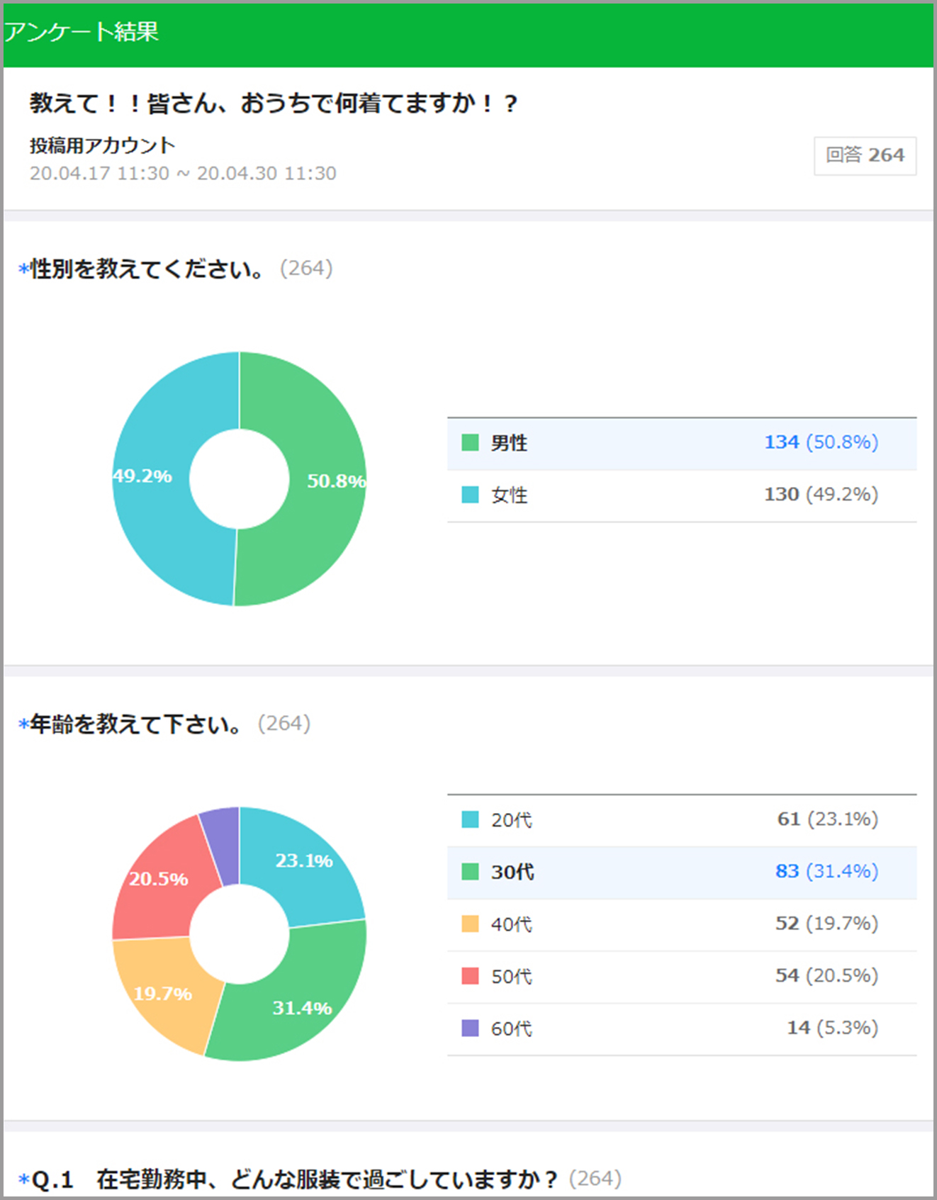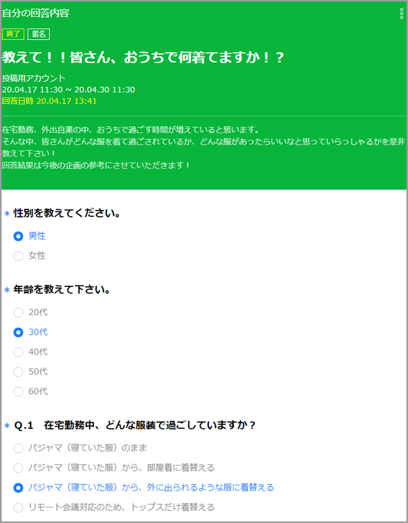新型コロナの影響で多数の社員が在宅勤務をするようになった際、ホームウエアを企画する部署がマーケティングの目的で、リモートワーク中にどんな服装をしているかを全社員にアンケート調査しました。