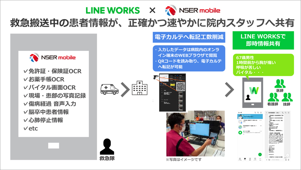 そこで注目したのが、TXP Medical社がリリースした救急情報連携システムのNSER mobile*です。これは救急隊が従来の電話に替わって患者情報をアプリに入力し、そのデータを病院に送信し情報連携します。(音声認識やカメラで撮影した画像解析といったデータ入力を補助する機能を有し、簡便な入力が可能)入力された患者情報は、院内にある専用パソコンに即時に共有されるとともに、自動で個人情報を加工したテキストデータがAPI連携したLINE WORKSのBotから救急外来の事務担当者、医師、看護師などの所有するスマホに同時に送信されます。折しもコロナ禍で救急隊と病院との情報連携を強化する必要も増していたことから、高島市消防本部と協力し、この仕組みを活用することを決めました。