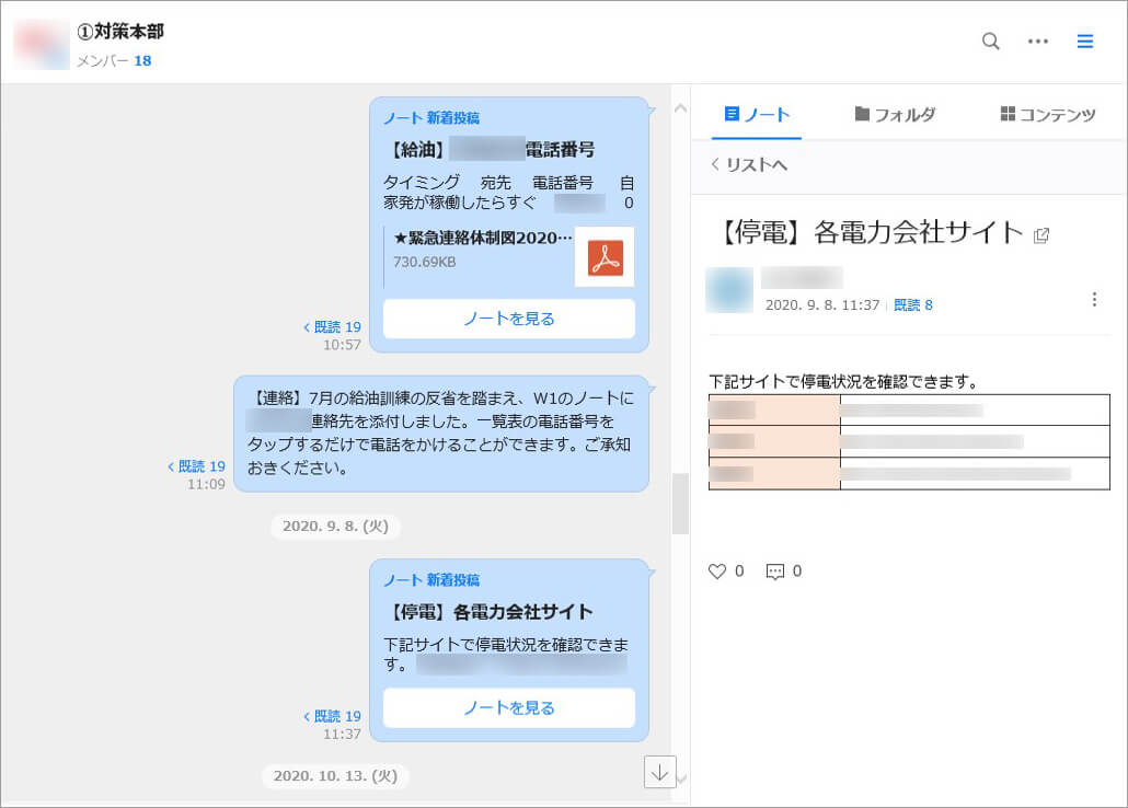 災害の状況確認にアンケート機能を使っているほか、災害時の対応ルールや手順、外部への連絡先などをホームの掲示板に記載しています。例えば、各事業所が備える非常用電源設備の燃料の注文先電話番号やメールアドレスなどをまとめています。これによって緊急時にPCを立ち上げたり、本社へ確認することなく対応できる体制を整えています。