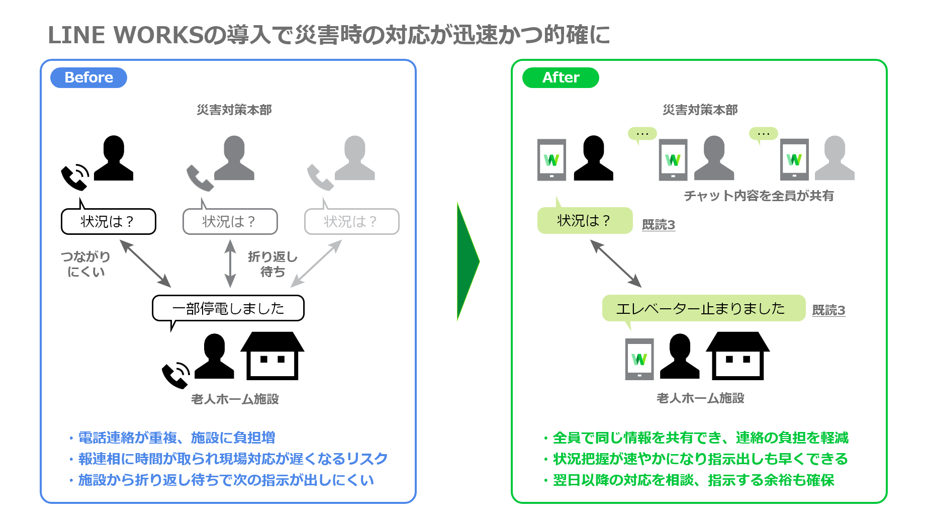 - 一度に複数人へ情報が発信でき、報告の重複を回避