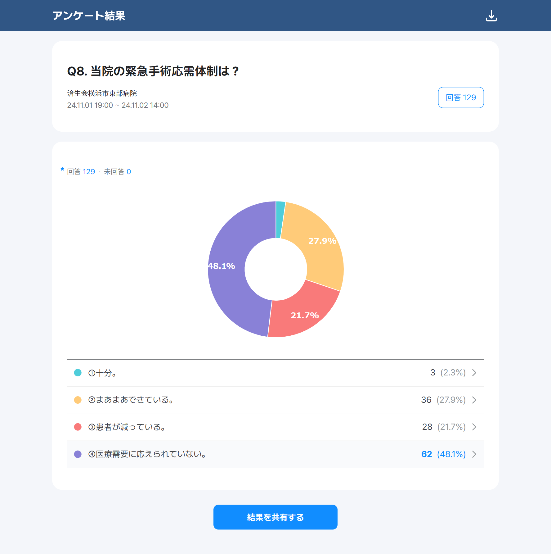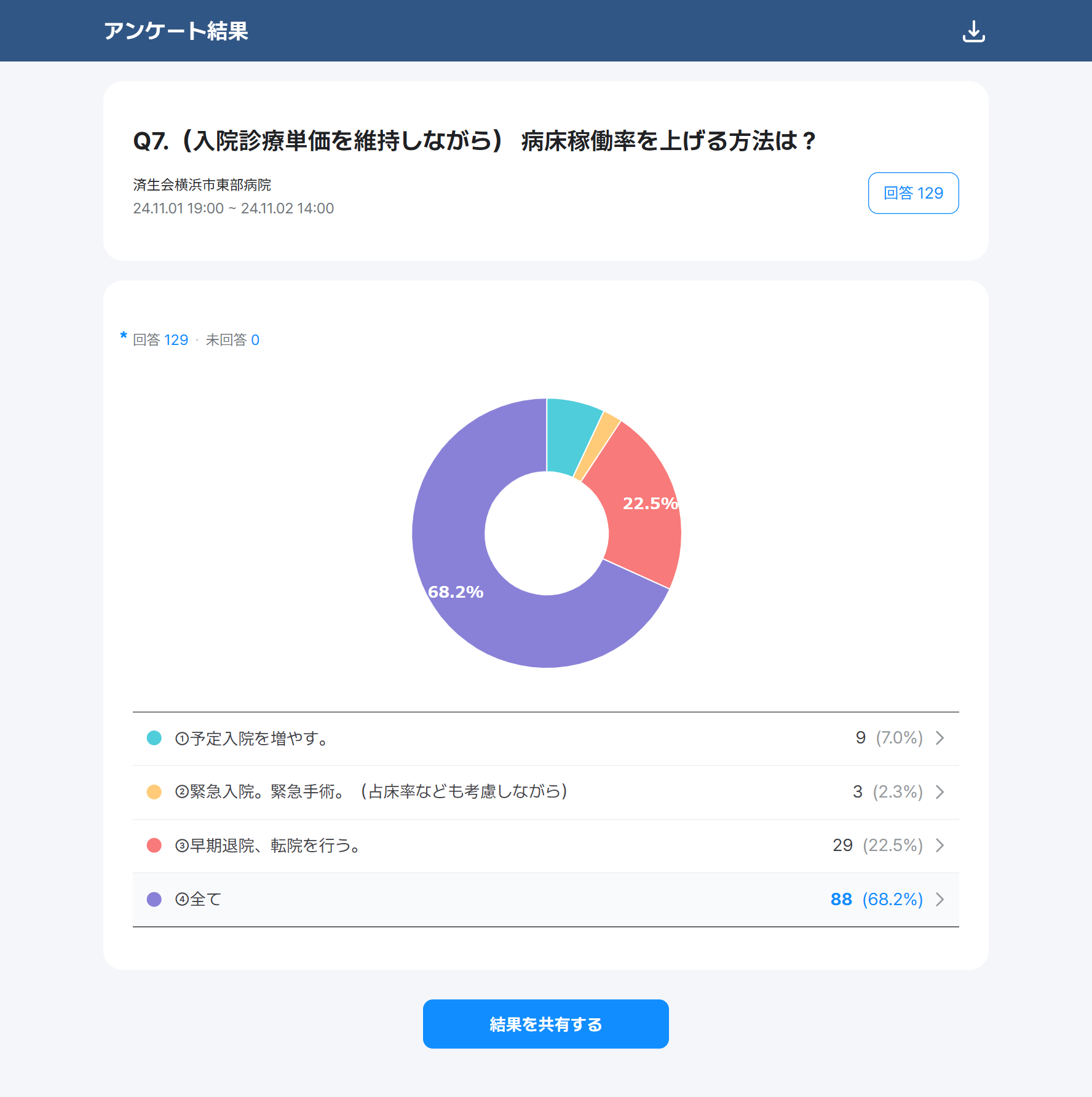 多数のメンバーが参加する会議での意見収集にアンケート機能を使っています。アンケート結果は瞬時に集計、グラフ表示されるので、会議の進行がスムーズになりました。