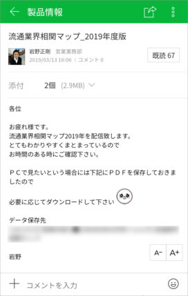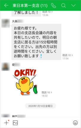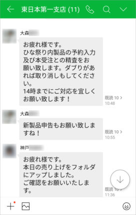 また、毎日決められた時間に売上や在庫状況などに関するリアルタイムな情報が各支店の事務担当者によって作成され、営業社員にトークで伝えられるようになりました。そうした情報は、以前はメールで報告されていたため、外出先でPCを起動して受信するには手間がかかりましたが、LINE WORKSなら手元のスマホで瞬時に確認することができます。