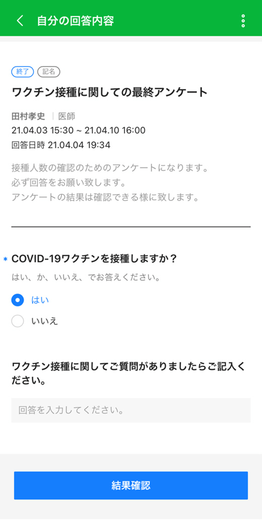 最近では新型コロナウイルス対策として、アンケート機能を使用して職員の体温や体調管理を行ったり、ワクチン接種の意向確認を行ったりました。