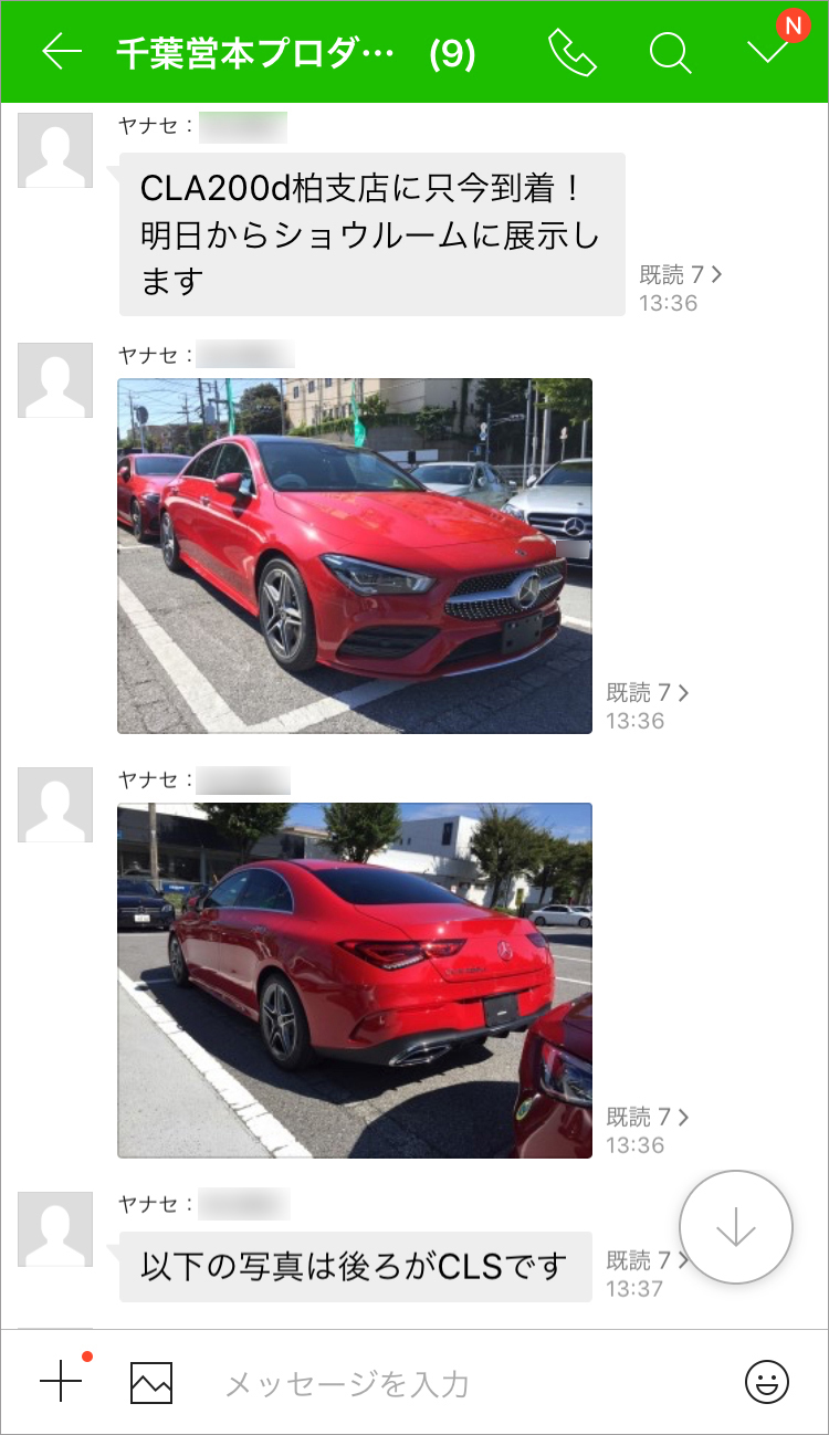 各支店では多様なトークグループが自然と作られてさまざまな情報共有がなされています。新車種のカタログが入荷したといった情報はメールより速くセールススタッフに周知され、既読が付くことで発信者も安心できます。また、トークに写真を添えられるので、ショウルームに展示する車の色なども正確に伝え合えるようになりました。