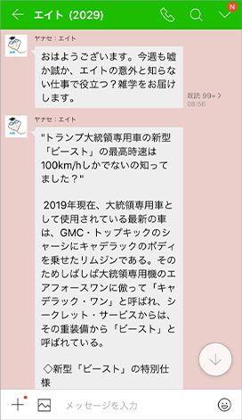 また、CRM推進課では、全社員のグループに向けて週1回、お客様のLINEとやり取りする際のマナーを啓発したり、商談時の会話に使えるタイムリーな話題やトリビアを提供しています。例えば、ラグビーワールドカップ開催期には、ラグビーボールが楕円形である理由を紹介しました。このアカウントは、「営業推進部の『えい』とトリビア(雑学)の『ト』を取って『エイトくん』と名付けています。お客様との連絡をスムーズにするだけではなく、全社の情報共有が促進されたことも、LINE WORKSを導入したことによる大きな成果です。
