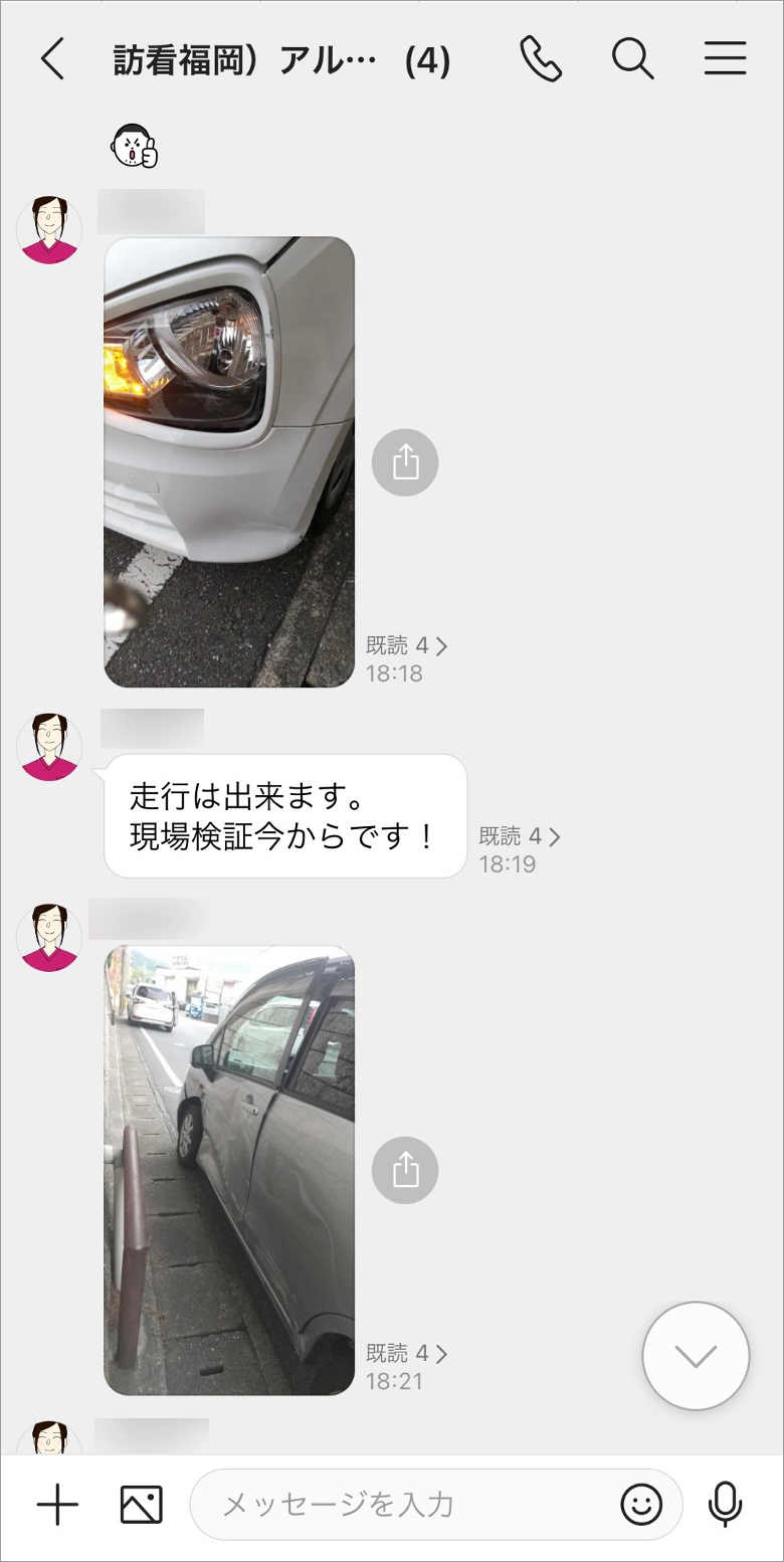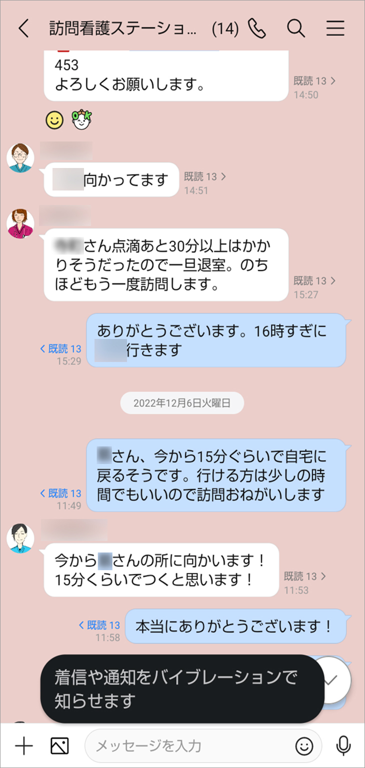 訪問看護師は車で移動しますが、事故渋滞に巻き込まれたり次の訪問先へ遅延しそうな際には、グループトークで代わりの看護師を募ることがあります。LINE WORKS導入前は、事故遅延が発生した場合、連絡を受けた管理者1人が対応を迫られていましたが、LINE WORKSを導入した現在は、グループ上で関係者全員に代わりの看護師を募ったり、対応できる看護師が「私、行けます」と連絡を入れてくれたりと、複数人での調整がスピーディになりました。
