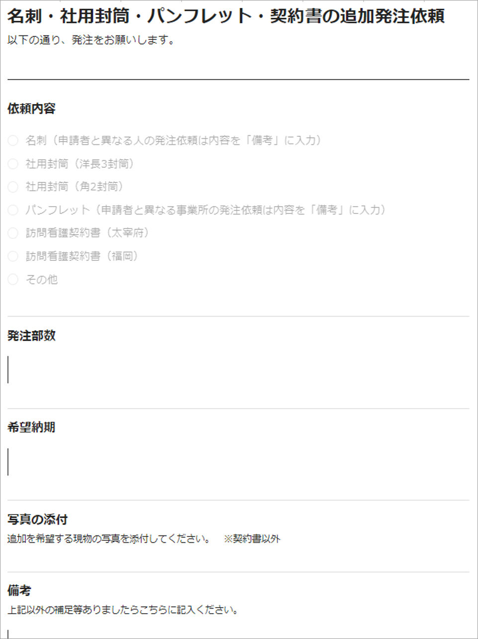 また掲示板には、各種お知らせや必読の業務連絡、社内提出書類のフォーマットなどを掲載しています。特に活用しているのが掲示板のテンプレート機能を使った「発注書のテンプレート」です。具体的には、名刺や封筒などの発注書のテンプレートを作成することで、各拠点の従業員は必要事項を入力するだけで本社の発注担当者に発注依頼が通知される仕組みです。
