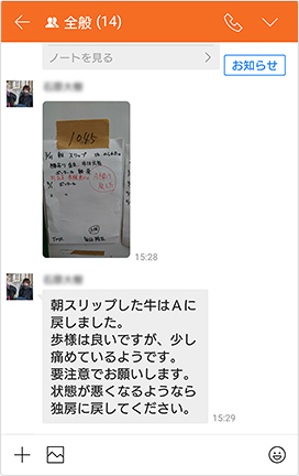 Also, in order to notify the symptom of the diseased milk cow in detail as well as to share professional information about the machine and facilities, we often share photos and videos through LINE. However, what we found problematic with LINE was that it was impossible to archive those attachments. For this reason, we hoped to use the business version of LINE if launched.