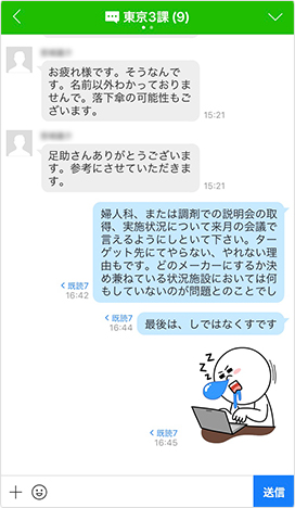 We are sharing information such as reactions of the doctors when making business-related contact, introducing our products, or even sharing the trends of the competitor companies through LINE WORKS. Also, when we need certain information, we use LINE WORKS to find the employee who knows about the information.