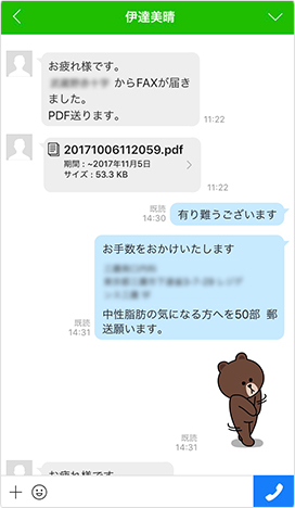 We are mainly using LINE WORKS as a means of delivering the customer contact history or the request to the MR, who is mostly working outside the office. For example, when we receive a contact from our customer asking for more supplies, we notify MR and ask him or her to make response accordingly to the contact.