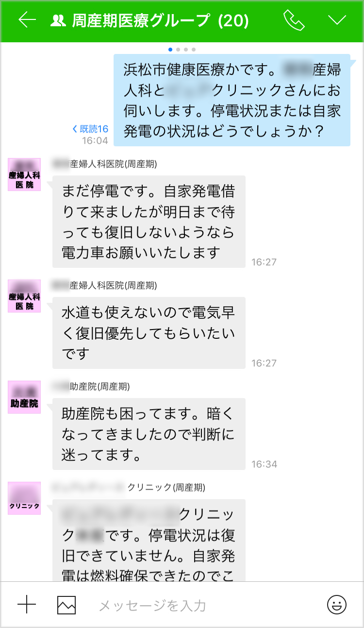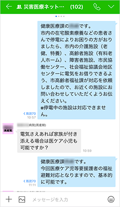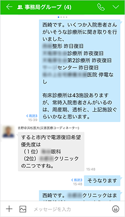 The second was the large-scale power outage caused by the influence of Typhoon 24 on September 30th, 2018. On the early morning of October 1st, Professor Yoshino, who was in charge of the disaster medical coordination in Shizuoka Prefecture, contacted me about the need to prepare for the disaster. Therefore, our city office urged each medical institution to enter the current state of damage in the EMIS (Emergency Medical Information System established by the Ministry of Health, Labor, and Welfare) via LINE WORKS. We were also able to input damage condition info in place of institutions that were not capable on their own; we would receive the updates on damage status to fill in the EMIS with LINE WORKS. By October 1st, the smooth connectivity among all parties enabled us to grasp most of the power outages of medical facilities in the city.