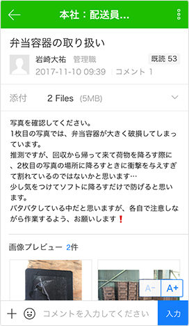 In the past, there used to be 200 calls made every day in the morning alone, but after introducing LINE WORKS, the figure significantly dropped to below 30. Thus, the time we had been spending on the phone decreased drastically and delivery mistakes that occurred from verbal exchange were also reduced, which we think helps contribute to improvement in customer satisfaction.