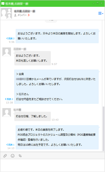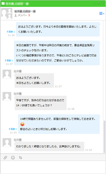 Most of our employees either visit and work at the clients’ office or give consulting to the clients outside the office. Due to this, ‘mobile-work’, which means work outside the office, was already settled down at our company. We have used free chatting tool for communication with the members working far away from the office. Also, we found the chatting very convenient since we did not have to start the conversation with the formal greetings like “Thank you for your work”.